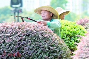 綠化工人在海心沙修剪花圃的植物,一頂草帽擋不住頭頂炙熱的陽(yáng)光。