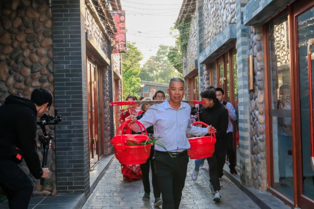 邱阿婆和林阿伯裝燒雞白酒的扁擔(dān)也準(zhǔn)備好了。按照習(xí)俗,大家要挑選一個(gè)在村里德高望重的長(zhǎng)輩,帶著新人前往玉虛宮祈福,邱阿婆想都沒想,脫口而出:“那阿其挑,讓阿其來挑!焙芸,大家一致推舉出“老村長(zhǎng)”廖志其來擔(dān)此重任,他接過扁擔(dān),樂呵呵地領(lǐng)著迎親隊(duì)伍往前走。廖志其是這幾對(duì)扶貧人愛情的見證者,也是魚咀村的致富帶頭人——很多扶貧項(xiàng)目虧得有其叔在中間做思想工作,幫扶貧人員和村民牽線搭橋,項(xiàng)目才得以順利推進(jìn)。