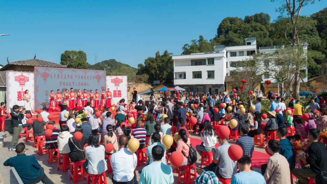 從魚咀開車一個(gè)多小時(shí),就到了英德連江口鎮(zhèn)連樟村,6對(duì)新人在汀步觀景臺(tái)舉行了簡(jiǎn)單的婚禮儀式。2018年習(xí)近平總書記在連樟村考察時(shí)說:“鄉(xiāng)親們一天不脫貧,我就一天放不下心來!爆F(xiàn)在的連樟村已經(jīng)大變樣了——2019年底,全村54戶131名貧困人口已經(jīng)全部達(dá)到脫貧退出標(biāo)準(zhǔn);農(nóng)家樂生意紅火,老板的拿手好菜麻竹筍炒肉片更是遠(yuǎn)近聞名。儀式當(dāng)天,國(guó)務(wù)院扶貧辦全國(guó)貧困村創(chuàng)業(yè)致富帶頭人(碧桂園連樟村)培訓(xùn)基地揭牌暨首次開班儀式在連樟村鄉(xiāng)村振興學(xué)院舉行,學(xué)院將為貧困地區(qū)培養(yǎng)出更多的創(chuàng)業(yè)致富帶頭人。
