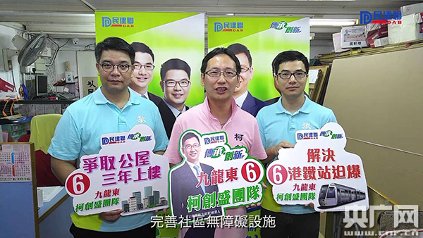 柯:其實(shí)這個口號就能很好的表現(xiàn)出兩個狀況的。第一個就是反映出民建聯(lián)是一個能夠給年輕人多點(diǎn)嘗試參與政治機(jī)會的政黨。我們希望通過“有年輕,有干勁”這種想法,向議會注入新的動力。讓九東的市民知道年輕人是有能力,能夠擔(dān)當(dāng)起政治工作。第二句創(chuàng)新為九東,是因?yàn)榫琵垨|面臨著很多老大難的問題,我們交通擁堵問題,長者人口多,貧窮問題嚴(yán)重,房屋問題備受關(guān)注。所以我們能夠希望通過新的思維,讓政府關(guān)注我們九龍東,所以就想到這個口號了。