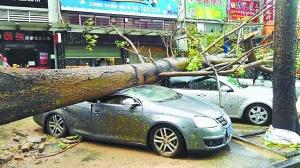 珠海市區(qū)幾輛小汽車(chē)被吹倒的樹(shù)木砸中。新華社發(fā)