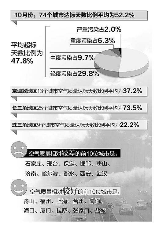 數(shù)據(jù)顯示,10月份,74個城市空氣質量達標天數(shù)比例平均為52.2%,有近一半城市達標天數(shù)比例不足50%。平均超標天數(shù)比例為47.8%,其中輕度污染占29.8%,中度污染占9.7%,重度污染占6.3%,嚴重污染占2.0%。與9月份相比,受秋冬季節(jié)轉換影響,主要污染物濃度中除臭氧外均有所上升,其中PM2.5、PM10濃度分別上升46.2%、39.6%。按照城市環(huán)境空氣質量綜合指數(shù)評價,10月份空氣質量相對較差的前10位城市分別是石家莊、邢臺、保定、邯鄲、唐山、濟南、哈爾濱、衡水、西安和武漢;空氣質量相對較好的前10位城市是舟山、福州、上海、臺州、南通、?凇B門、拉薩、張家口和鹽城。