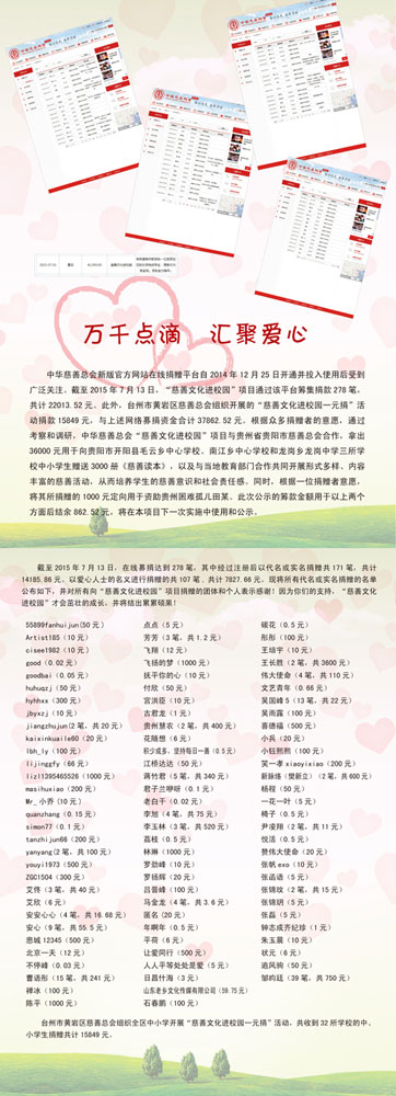 中華慈善總會(huì)新版官方網(wǎng)站在線捐贈(zèng)平臺(tái)自2014年12月25日開(kāi)通并投入使用后受到廣泛關(guān)注。截至2015年7月13日,“慈善文化進(jìn)校園”項(xiàng)目通過(guò)該平臺(tái)籌集捐款278筆,共計(jì)22013.52元。此外,臺(tái)州市黃巖區(qū)慈善總會(huì)組織開(kāi)展的“慈善文化進(jìn)校園一元捐”活動(dòng)捐款15849元,與上述網(wǎng)絡(luò)募捐資金合計(jì)37862.52元。根據(jù)眾多捐贈(zèng)者的意愿,通過(guò)考察和調(diào)研,中華慈善總會(huì)“慈善文化進(jìn)校園”項(xiàng)目與貴州省貴陽(yáng)市慈善總會(huì)合作,拿出36000元用于向貴陽(yáng)市開(kāi)陽(yáng)縣毛云鄉(xiāng)中心學(xué)校、南江鄉(xiāng)中心學(xué)校和龍崗鄉(xiāng)龍崗中學(xué)三所學(xué)校中小學(xué)生贈(zèng)送3000冊(cè)《慈善讀本》,以及與當(dāng)?shù)亟逃块T合作共同開(kāi)展形式多樣、內(nèi)容豐富的慈善活動(dòng),從而培養(yǎng)學(xué)生的慈善意識(shí)和社會(huì)責(zé)任感。同時(shí),根據(jù)一位捐贈(zèng)者意愿,將其所捐贈(zèng)的1000元定向用于資助貴州困難孤兒田某。此次公示的籌款金額用于以上兩個(gè)方面后結(jié)余862.52元,將在本項(xiàng)目下一次實(shí)施中使用和公示。