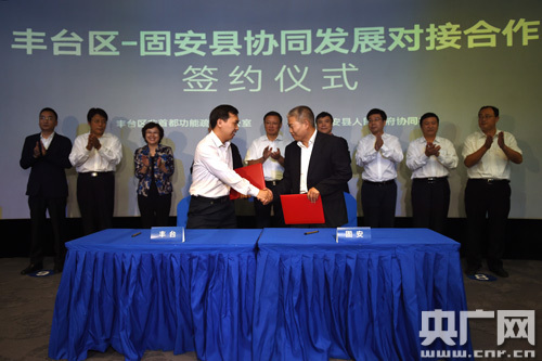 簽約儀式在北京豐臺(tái)區(qū)人民政府新聞發(fā)布廳舉行。簽約儀式上,北京市豐臺(tái)區(qū)與河北省固安縣就豐臺(tái)區(qū)商貿(mào)物流產(chǎn)業(yè)集群轉(zhuǎn)移升級(jí)至固安事宜簽訂戰(zhàn)略合作協(xié)議。