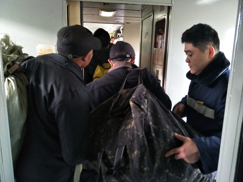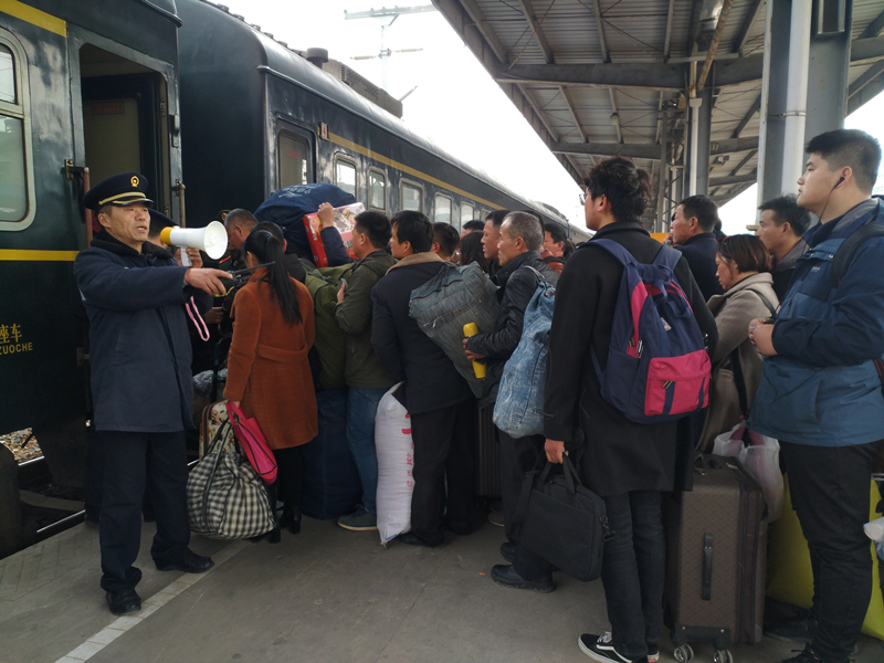 (鄭利軍帶領黨員突擊隊到重點車車門口疏導旅客上車,加快旅客上車速度。)
