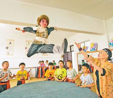 5月25日,江蘇海安市城東鎮(zhèn)西場(chǎng)小學(xué)的學(xué)生在練習(xí)京劇基本功。