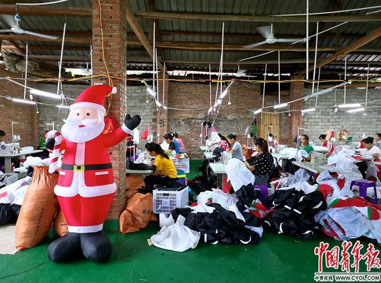 某個美國餐廳網(wǎng)上訂購的圣誕老人充氣玩具,此刻可能正在貴州山區(qū)的扶貧車間里緊鑼密鼓地加工著。7月8日,記者在貴州省黔東南州黎平縣九潮鎮(zhèn)的扶貧車間看到,許多年輕人從留守務農、在外打工變成家鄉(xiāng)車間里的技術工人,他們每人每月平均會有兩三千元穩(wěn)定收入,也有更多時間陪伴孩子、照顧家庭。工廠有穩(wěn)定的外貿訂單,互聯(lián)網(wǎng)讓村子連通世界,也找到脫貧奔小康的新路。(記者 白皓)