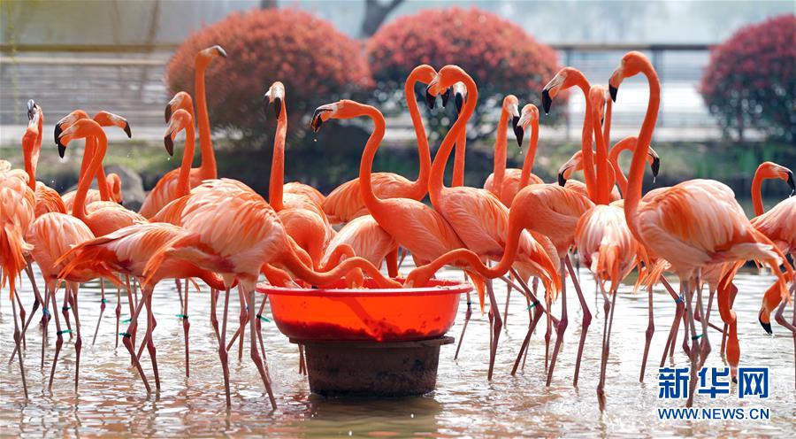 3月13日,武漢動物園的火烈鳥在進食。 新冠肺炎疫情發(fā)生后,武漢動物園于1月22日起暫停開放,園區(qū)數(shù)十名員工一直堅守崗位,悉心為動物們喂食、對公共區(qū)域消毒殺菌,保證動物們在疫情期間生存環(huán)境安全舒適。武漢動物園占地達64萬平方米,園區(qū)里有大熊貓、小熊貓、火烈鳥、長頸鹿、企鵝、河馬、袋鼠等近百種約千頭(只)動物。 新華社記者 才揚 攝