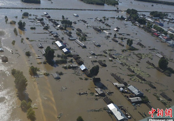 8月26日,黑龍江同江段地方搶險持續(xù)進行。圖為航拍的黑龍江同江段災情。中新社發(fā) 楊再新 攝
