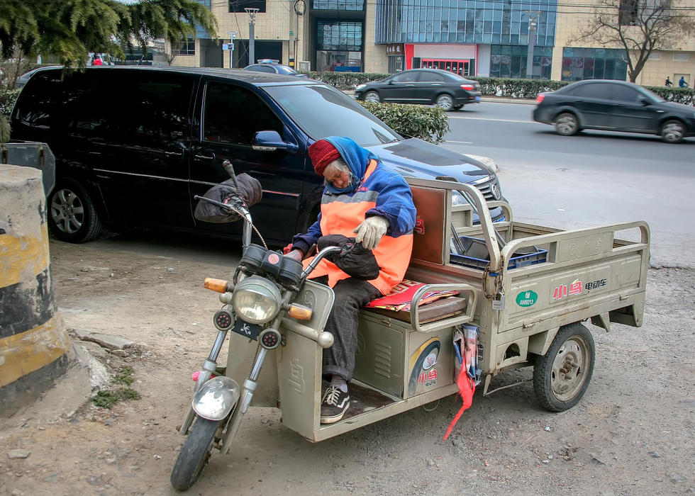 2016年2月21日,江蘇省徐州市,一位年邁的環(huán)衛(wèi)工老奶奶把大街上的紙屑和垃圾打掃的干干凈凈,清理完畢后,疲勞地坐睡在路旁的電動(dòng)三輪車(chē)座位上。