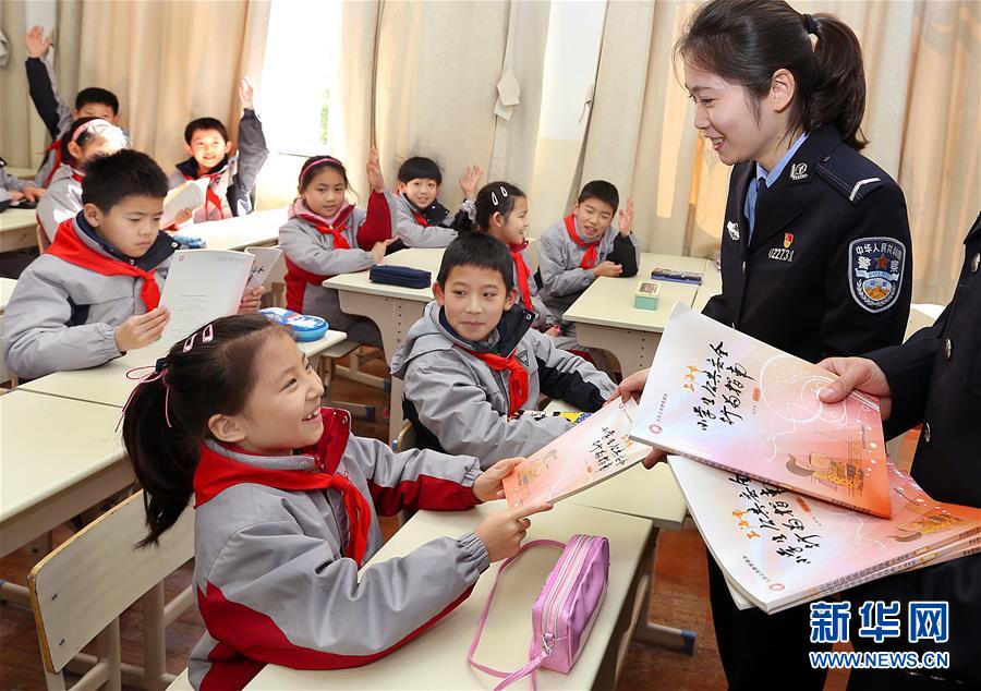2月23日,上海市公安局徐匯分局徐家匯派出所民警黃雯怡(右一)向匯師小學學生發(fā)放公共安全教育教學補充讀本。當日是上海中小學開學第一天,由上海市公安局和市教委在現有教材基礎上組織編撰的6冊全新的公共安全教育教學補充讀本被發(fā)放到中小學和幼兒園,供教師教學參考使用。新華社記者 凡軍 攝