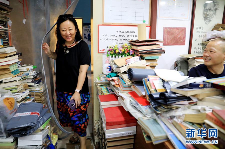 7月13日,一名讀者(左)走進(jìn)復(fù)旦舊書(shū)店。 在上海楊浦區(qū)政肅路一家菜市場(chǎng)的樓上,有一家專門(mén)經(jīng)營(yíng)舊書(shū)的書(shū)店,67平方米的空間外加半環(huán)繞的閣樓上,近五萬(wàn)本各類書(shū)籍將必要通道以外的所有空間占滿,空氣中彌漫著舊書(shū)特有的氣息。書(shū)店的主人是來(lái)自江蘇鹽城的張強(qiáng)夫婦。從2002年開(kāi)店至今,這家只出售舊書(shū)的書(shū)店靠著愛(ài)書(shū)人的口耳相傳,漸漸有了點(diǎn)名氣。張強(qiáng)介紹說(shuō),曾經(jīng)也想給書(shū)店起一個(gè)有點(diǎn)內(nèi)涵的名字,但因?yàn)殚_(kāi)在復(fù)旦大學(xué)生活區(qū)內(nèi),又是經(jīng)營(yíng)舊書(shū)的,大家口中的“復(fù)旦舊書(shū)店”這個(gè)名字就被沿用了下來(lái)。 復(fù)旦舊書(shū)店里的書(shū)籍,從漫畫(huà)書(shū)到工具書(shū),品類繁雜應(yīng)有盡有。這里的書(shū)籍沒(méi)有分類,是因?yàn)閺垙?qiáng)想讓讀者在有限空間里看到更多不同種類的書(shū)籍,既為來(lái)到這里的讀者找書(shū),也為這里的書(shū)找讀者。 新華社記者 方喆 攝