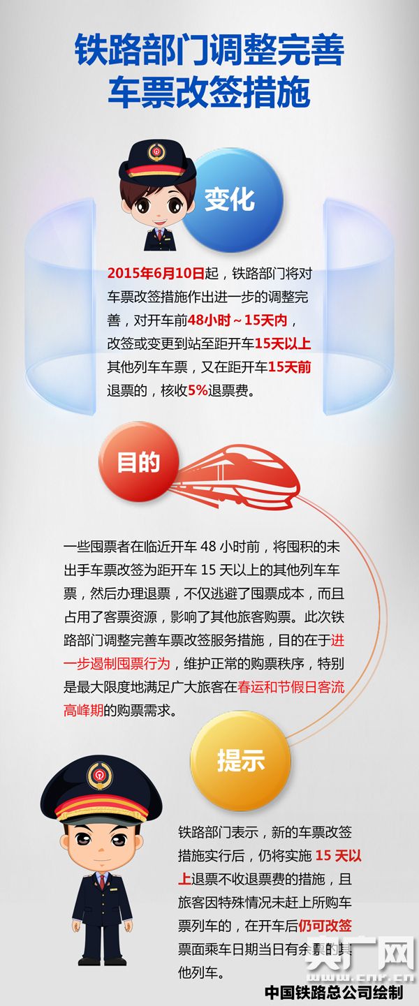 央廣網北京6月8日消息(記者何微)記者從中國鐵路總公司獲悉,為維護公平的購票秩序,最大限度用好寶貴的鐵路客票資源,自2015年6月10日起,鐵路部門將對車票改簽措施作出進一步的調整完善,對開車前48小時~15天內,改簽或變更到站至距開車15天以上其他列車車票,又在距開車15天前退票的,核收5%退票費。