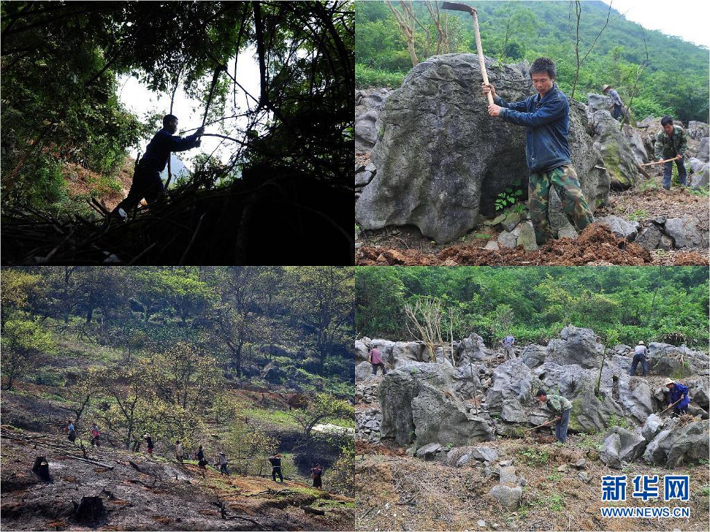 拼版照片:融安縣東起鄉(xiāng)銅板屯村民改造荒山。上左:銅板屯村民龍飛聯(lián)在山上砍雜草(2013年7月23日新華社記者黃孝邦攝);上右:銅板屯村民龍革雄在開墾荒地準(zhǔn)備種植李子樹苗(2013年5月15日新華社記者黃孝邦攝);下左:銅板屯村民們上山開荒(2013年3月5日新華社記者黃孝邦攝);下右:銅板屯村民們?cè)诜N樹(2013年5月15日新華社記者張愛林?jǐn)z)。新華社發(fā)