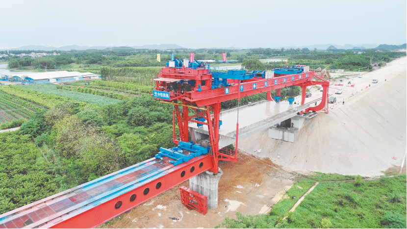南玉鐵路橫縣白花特大橋首孔箱梁架設成功。(王志鵬 攝)