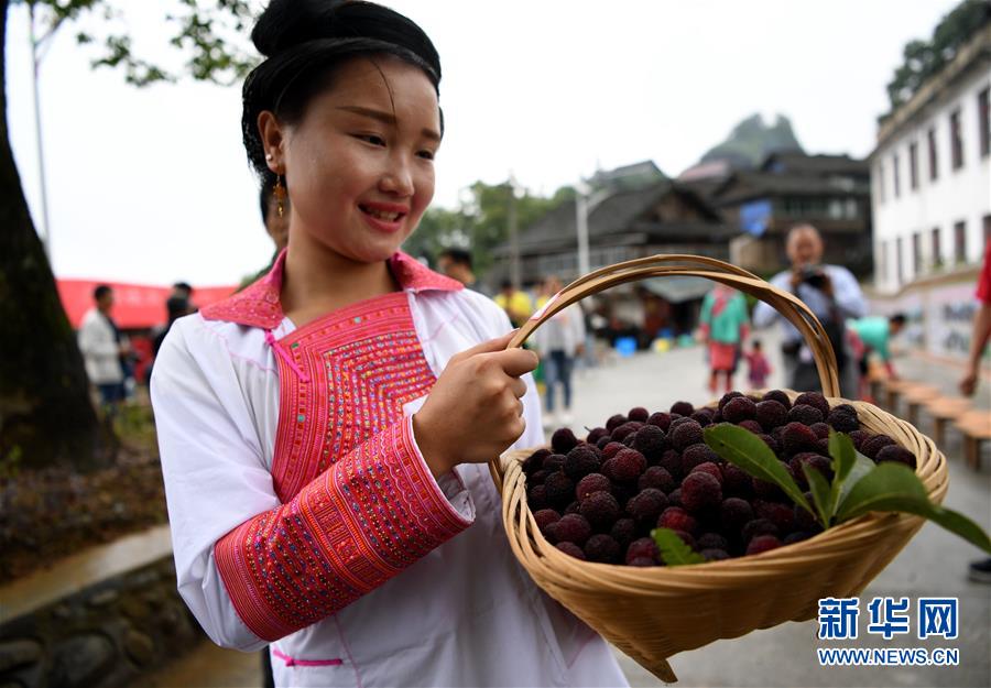 6月3日,一名苗族姑娘在楊梅節(jié)上展示楊梅。當日,貴州省黔東南苗族侗族自治州榕江縣高文苗寨舉辦楊梅節(jié),吸引眾多游客參加“楊梅大王”評選、吃楊梅比賽、吹蘆笙、跳蘆笙舞等趣味活動。新華社發(fā)(王炳真 攝) -