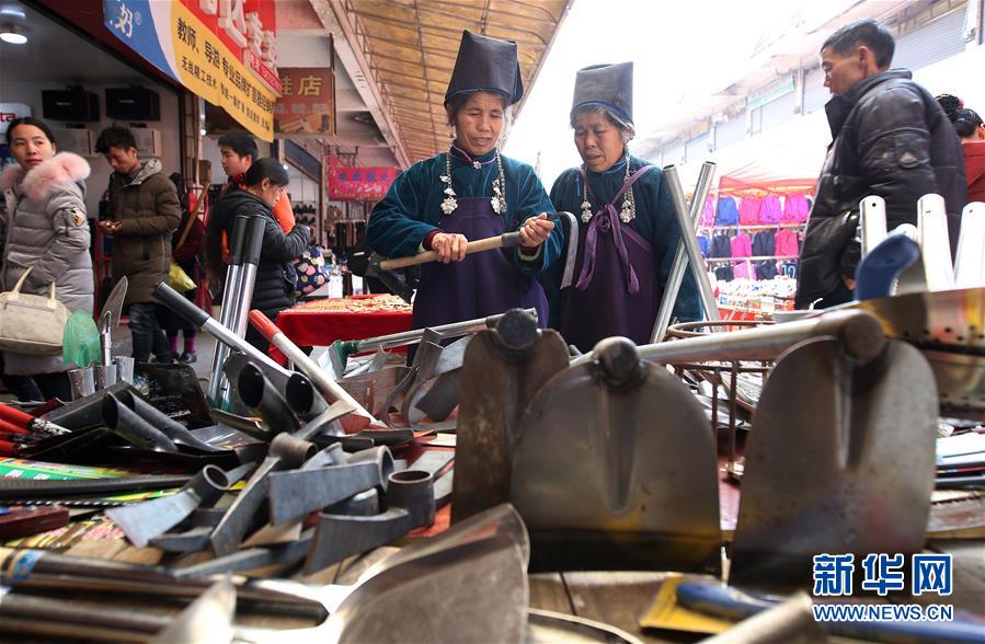 •   2月24日,在貴州省丹寨縣縣城,人們?cè)谶x購(gòu)農(nóng)具。眼下正值春耕備播時(shí)節(jié),各地農(nóng)民挑選合適農(nóng)資,為春耕生產(chǎn)做準(zhǔn)備。新華社發(fā)(黃曉海 攝)
