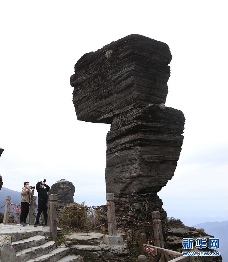 3月15日,游客在貴州省銅仁市梵凈山景區(qū)蘑菇石景點(diǎn)拍照。