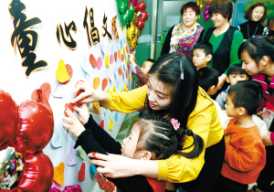 圖為孩子們和家長(zhǎng)將“文明禮儀”宣傳卡張貼在社區(qū)文明墻上。