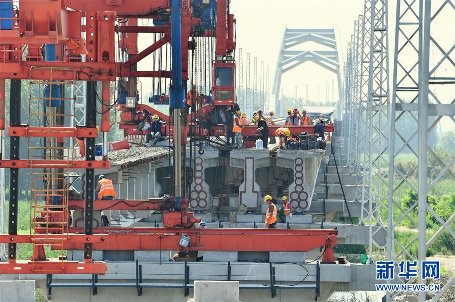 7月12日,工人在唐曹鐵路曹妃甸區(qū)境內(nèi)的跨唐曹高速公路引線大橋施工。近日,河北省唐山市的唐(唐山)曹(曹妃甸)鐵路架梁、鋪軌同時(shí)展開,確保年內(nèi)建成通車。據(jù)介紹,唐曹鐵路北起唐山站,南至曹妃甸工業(yè)區(qū)臨港商務(wù)區(qū)站,正線全長76.371公里,設(shè)計(jì)時(shí)速160公里。新華社記者楊世堯攝 -