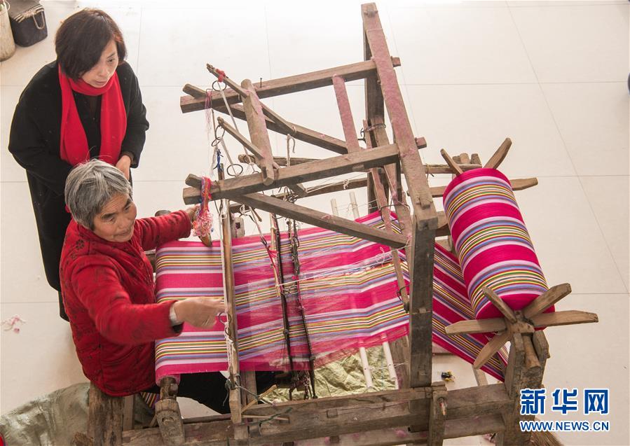 11月27日,在河北省石家莊市欒城區(qū),手工土布藝人馮素芬(左)指導(dǎo)居民織土布。馮素芬是石家莊欒城手工土布藝人。她在傳承當(dāng)?shù)赝敛技徔椉妓嚨耐瑫r(shí),不斷挖掘整理當(dāng)?shù)赝敛嘉幕嘤?xùn)當(dāng)?shù)鼐用窦尤氲娇椡敛嫉漠a(chǎn)業(yè)中來(lái),一同開發(fā)土布創(chuàng)意產(chǎn)品,讓更多家庭走上增收致富的道路。新華社發(fā)(蒲東峰 攝)