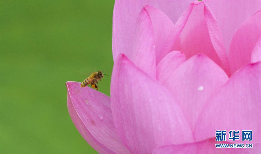 在河北省遵化市團(tuán)瓢莊鄉(xiāng)山里各莊村,一只蜜蜂飛舞在荷花間(7月1日攝)。新華社發(fā)(劉滿倉(cāng) 攝)