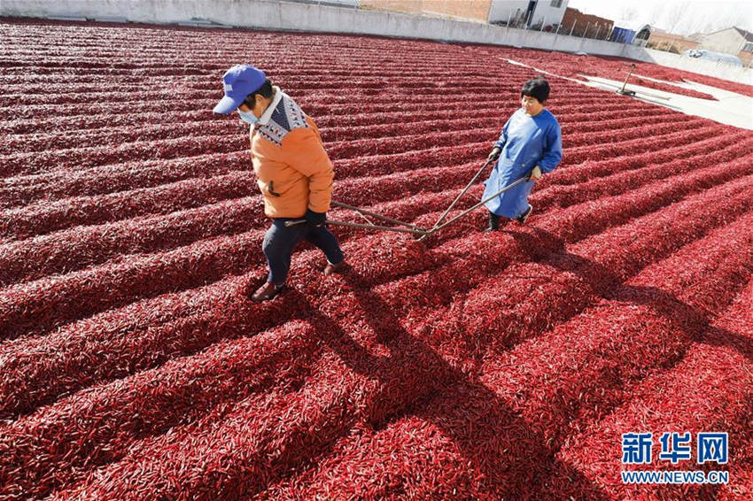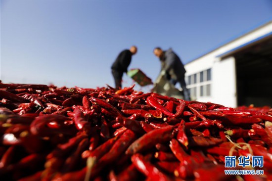 12月4日,河北省唐山市玉田縣亮甲店鎮(zhèn)黃林村農(nóng)民在場(chǎng)院晾曬辣椒。 當(dāng)日,河北省唐山市玉田縣亮甲店鎮(zhèn)黃林村農(nóng)民們利用晴好天氣,采摘、晾曬、包裝豐收的辣椒,場(chǎng)院里一片繁忙。 新華社發(fā)(劉滿倉(cāng) 攝)