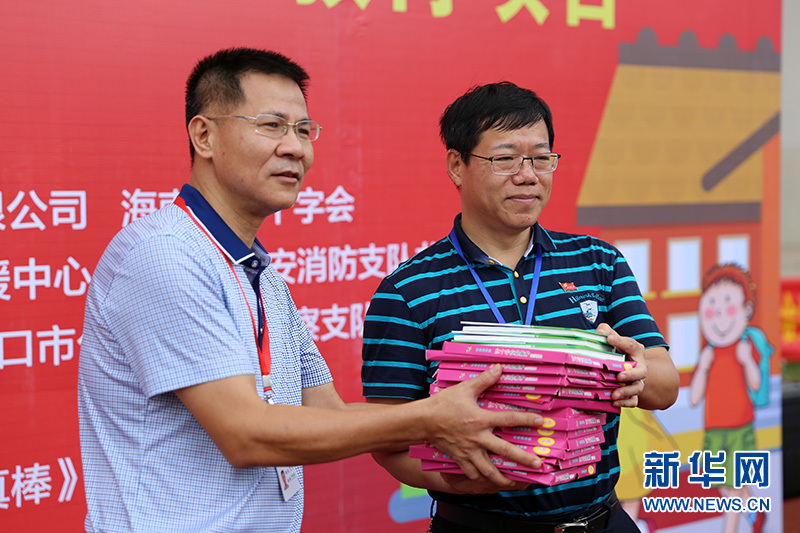 海南省紅十字會(huì)常務(wù)副會(huì)長周瑾(左)代表海南省紅十字會(huì)向海口市玉沙實(shí)驗(yàn)學(xué)校贈(zèng)送救護(hù)知識(shí)書籍。