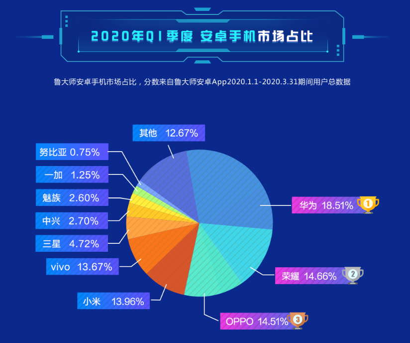 在這種“逆境下”,華為、榮耀的市場份額依舊保持著遙遙領先的姿態(tài)。根據(jù)魯大師2020年Q1季度安卓新增市場占比來看,華為、榮耀兩者加起來就占據(jù)了Q1市場33.17的份額,甩開了其他國產(chǎn)品牌一大截,實現(xiàn)了逆勢增長。
