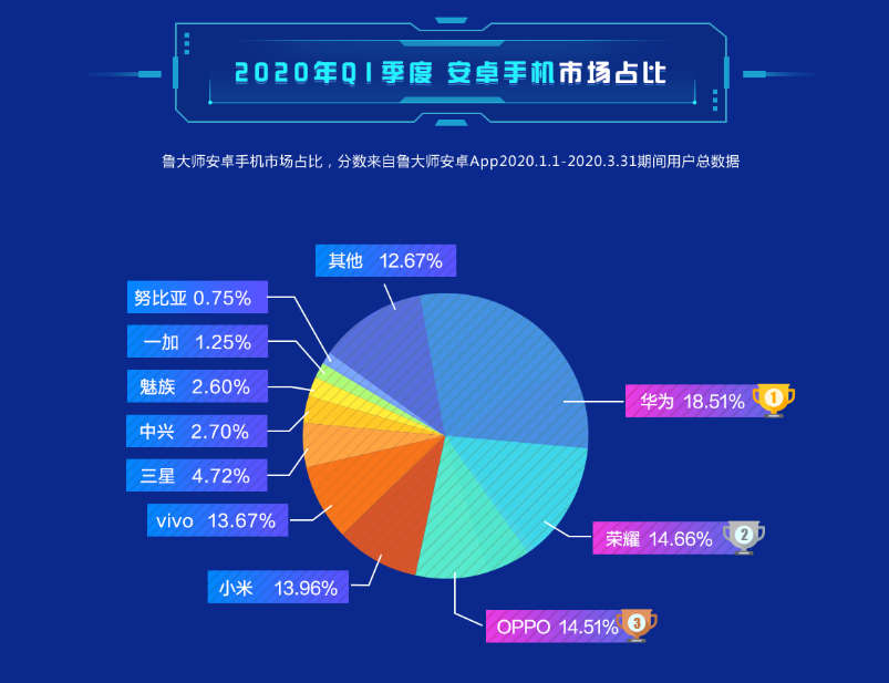 最新發(fā)布的魯大師2020年Q1季度報(bào)告中,魯大師新增安卓手機(jī)市場(chǎng),華為以18.51%的絕對(duì)優(yōu)勢(shì)占據(jù)手機(jī)市場(chǎng)份額第一。緊隨其后的是榮耀和OPPO,市場(chǎng)占比分別為14.66%和14.51%,而小米則被OPPO超越以13.97%的份額排名第四。