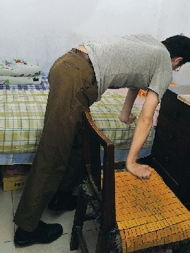 這樣保持了兩分鐘,他開始用手撐住腳部慢慢向上挪動(dòng),到膝蓋位置時(shí)他喘了口氣,右手扶住膝蓋,左手扶住椅子,身體仍90度彎曲。就這樣,他靠著椅子做支點(diǎn),上半身帶動(dòng)下半身,讓僵硬的兩條腿向床邊靠近。