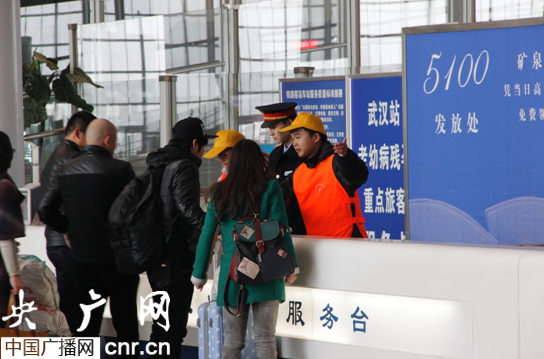 央廣網(wǎng)河南分網(wǎng)消息 1月16日,武漢鐵路職業(yè)技術(shù)學(xué)院“力挺”武漢2014年春運(yùn)工作,100余名大學(xué)生參加了武漢站、武昌站、漢口站的鐵路春運(yùn)志愿服務(wù)工作。