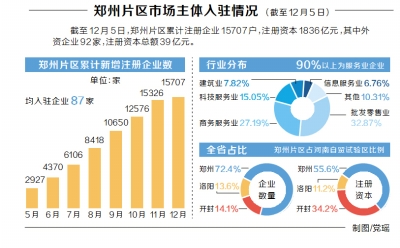 截至11月30日,鄭州片區(qū)新注冊企業(yè)15326戶,注冊資本總額1787億元,其中內(nèi)資注冊資本總額1748億元,外資企業(yè)91戶、注冊資本39億元。注冊資本超過億元的企業(yè)266戶,注冊資本725億元。