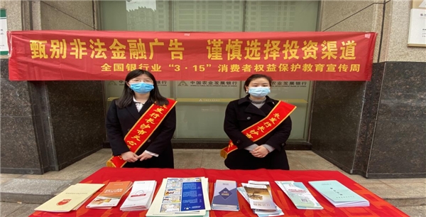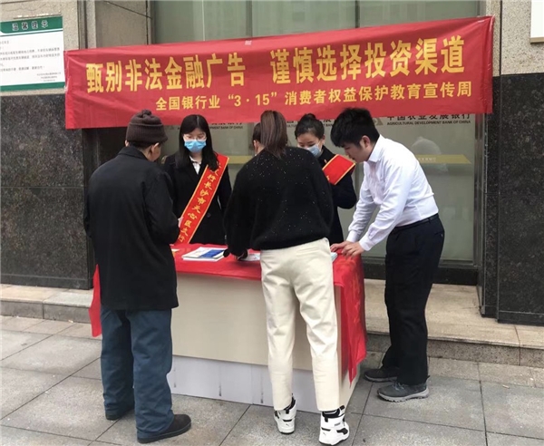 為全面落實銀保監(jiān)會工作要求,加強金融消費保護和消費教育,維護經(jīng)濟金融安全和消費者合法權(quán)益。3月15日,農(nóng)發(fā)行天心區(qū)支行開展“甄別非法金融廣告,謹慎選擇投資渠道”“3.15”消費者權(quán)益保護教育為主題的宣傳活動。