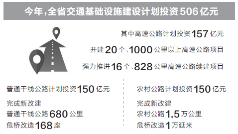 今年,全省交通基礎(chǔ)設(shè)施建設(shè)計(jì)劃投資506億元,其中高速公路計(jì)劃投資157億元。強(qiáng)力推進(jìn)16個(gè)、828公里高速公路續(xù)建項(xiàng)目。普通干線公路計(jì)劃投資150億元,重點(diǎn)實(shí)施低等級(jí)公路升級(jí)改造、城鎮(zhèn)過境段建設(shè),完成新改建普通干線公路680公里,危橋改造168座;農(nóng)村公路計(jì)劃投資150億元,完成新改建農(nóng)村公路1.5萬公里,危橋改造1萬延米。(記者 董娉)
