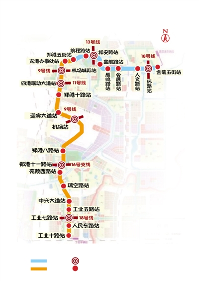線路主要沿巢湖路(原龍中公路)、華夏大道(原四港聯(lián)動(dòng)大道)、迎賓大道、機(jī)場(chǎng)、雍州路(航興路)敷設(shè),出工業(yè)十路站后線路繼續(xù)向南敷設(shè),接入港區(qū)至許昌市域鐵路(許昌段),線路全長(zhǎng)約35.20km,其中地下線長(zhǎng)約29.785km,過(guò)渡段長(zhǎng)約0.515km,高架段長(zhǎng)約4.9km。