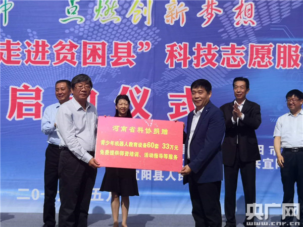 啟動儀式上,房衛(wèi)平、吳廷偉、賀敏等為開展“科普大篷車走進(jìn)伏牛山走進(jìn)貧困縣”科技志愿服務(wù)活動的宜陽縣、汝陽縣、洛寧縣等5個縣授旗。省科協(xié)青少年科技中心組織鄭州昊眾電子科技有限公司等愛心單位,向洛陽市三所中小學(xué)捐贈了60套價(jià)值33萬元的機(jī)器人工作室器材設(shè)備,并將為受捐的學(xué)校提供師資培訓(xùn)和活動指導(dǎo)等后續(xù)服務(wù)。為了配合本次活動,河南科技報(bào)社精心準(zhǔn)備了10余萬份科技教育學(xué)習(xí)和?,將在活動期間向104所鄉(xiāng)鎮(zhèn)學(xué)校免費(fèi)發(fā)放。