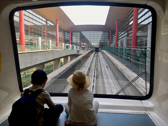 首都機(jī)場(chǎng)T3航站樓,前往國(guó)際登機(jī)口的小火車上,兩個(gè)孩子并排坐著看著外面。一到假期,首都機(jī)場(chǎng)每天進(jìn)出港人數(shù)達(dá)到幾十萬,其中許多是中小學(xué)生前往世界各地。笑槑/攝