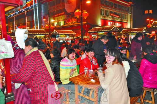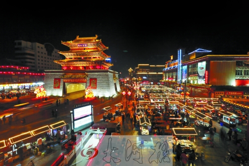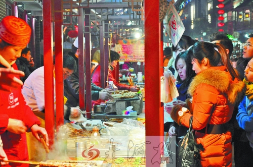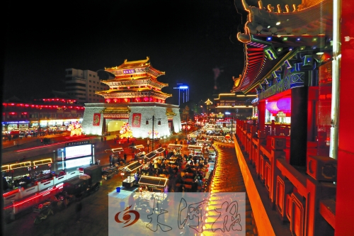 2013年12月28日晚,在剛剛復(fù)建竣工的鼓樓四周,大大小小的紅燈籠,搖曳在高脊挑檐、青磚綠瓦間,搖蕩在頭上蓋了個“瓦當帽”透著古色的餐車上……粗聲大嗓的叫賣,烹炒煎炸的香味兒,融成一種特有的熟悉味道……鼓樓夜市回歸。