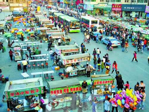 鼓樓廣場的格局已完全不同,廣場南北兩條街道為步行街,東西兩條街道改為由西向東的單行道(公交車除外)。鼓樓城門洞下的直道為機動車道,左右兩邊的環(huán)道為公交車道。夜市攤位分布在環(huán)道四周大小不等4個區(qū)域的人行道上,車道與攤位有了明顯的界線,交通秩序大為改觀。