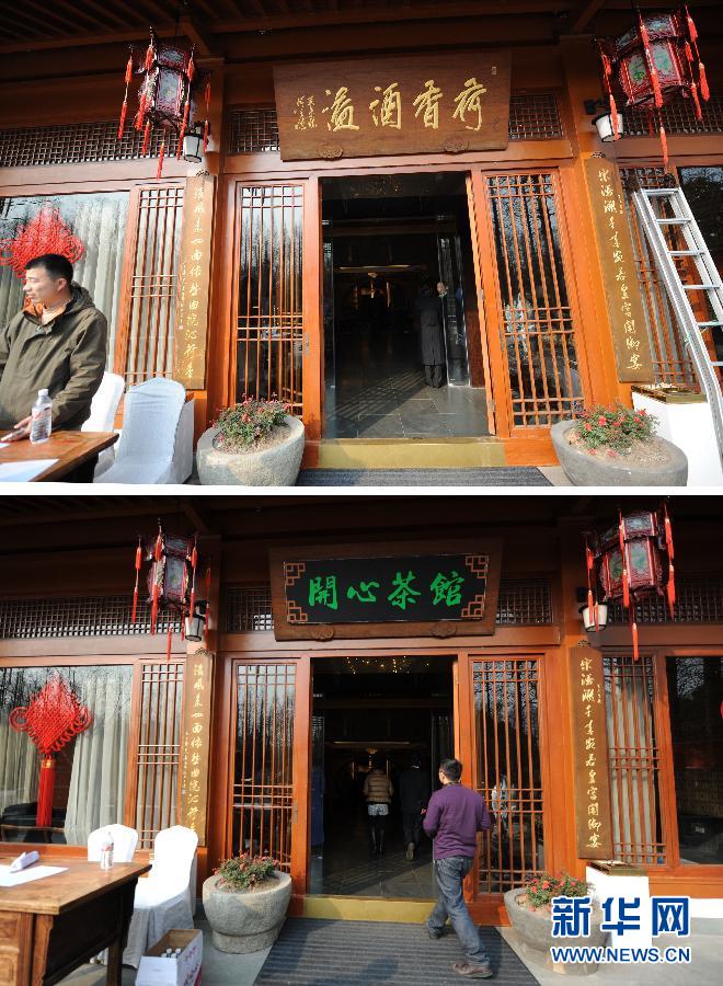 央廣網(wǎng)河南分網(wǎng)消息 據(jù)新華網(wǎng)報(bào)道:2014年1月27日,在杭州西湖十景之一的“曲院風(fēng)荷”內(nèi),高檔會所“西湖會”的“荷香酒溢”招牌(上圖)被換成大眾化的“開心茶館”(下圖)(拼版照片)。轉(zhuǎn)型后的“西湖會”從一家高檔經(jīng)營場所變身為服務(wù)大眾、經(jīng)營大眾餐飲的場所。截至當(dāng)日,西湖景區(qū)已關(guān)停30家高檔經(jīng)營場所,并陸續(xù)將這些高檔會所轉(zhuǎn)型成大眾化的服務(wù)場所。