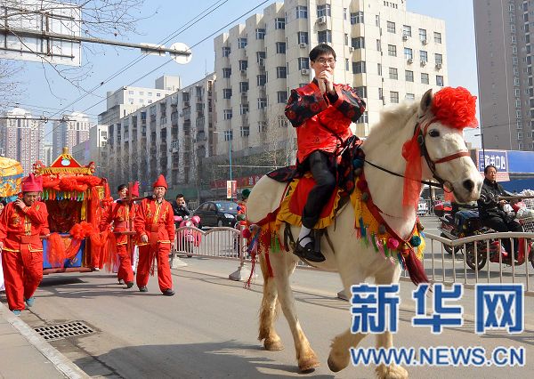 央廣網(wǎng)河南分網(wǎng)消息 據(jù)新華網(wǎng)河南頻道報(bào)道:當(dāng)日,在鄭州市區(qū),一支花轎迎親隊(duì)伍格外惹眼。整個(gè)婚禮儀仗隊(duì)有40余人,新郎騎白馬,喜娘坐花轎,吹吹打打,招搖過市,向路人展示熱鬧、喜慶的中式傳統(tǒng)婚俗文化。
