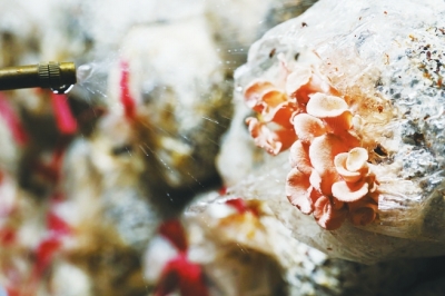 隨后,記者在王冬冬的帶領下進入了食用菌大棚,只見里面密密麻麻地擺滿了菌袋,幾名大學生正在往棚里噴水以增加濕度。采訪中,菌袋上粉色的平菇吸引住了記者!斑@是我們自己培育的新品種,具有觀賞性和食用性,而且比一般平菇口感更好,目前市場上還沒有此品種!蓖醵嬖V記者。