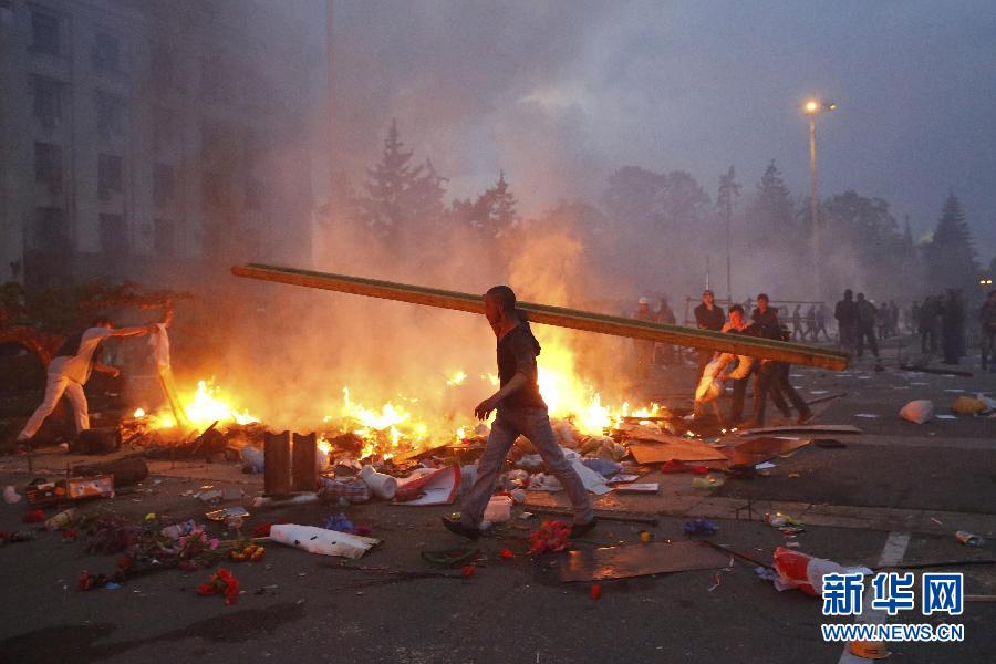 央廣網河南分網消息 據(jù)新華網報道:繼烏克蘭軍警5月2日凌晨對烏東部城市斯拉維揚斯克發(fā)起攻勢后,烏南部黑海沿岸城市敖德薩同日發(fā)生親政府與反政府兩派民眾沖突,造成嚴重人員傷亡。烏克蘭東部局勢持續(xù)緊張。一名歐盟成員國駐布魯塞爾的高級外交官對新華社記者表示,他認為,隨著烏克蘭軍方2日(向反政府武裝人員)發(fā)起攻擊,烏克蘭內戰(zhàn)已經打響。5月2日是烏克蘭危機發(fā)生質變的節(jié)點。俄羅斯聯(lián)邦委員會國際事務委員會副主席克里莫夫認為,在敖德薩和烏克蘭東南部發(fā)生的流血事件可以視為烏克蘭內戰(zhàn)的序幕。圖為5月2日,在烏克蘭南部城市敖德薩,工會大樓附近的一個臨時帳篷被燒毀。烏克蘭南部黑海沿岸城市敖德薩2日發(fā)生親政府與反政府兩派民眾沖突,導致43人死亡。新華社發(fā)