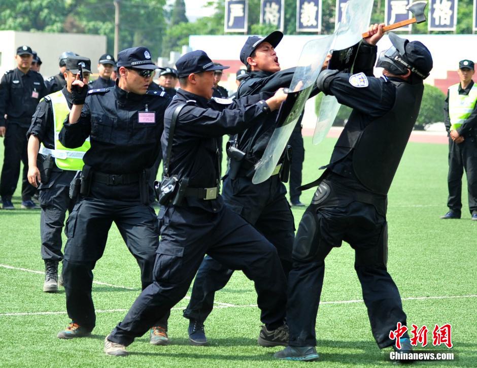 央廣網(wǎng)河南分網(wǎng)消息 據(jù)中國新聞網(wǎng)報道:5月6日,河北石家莊警察學校操場,多個“暴恐”實戰(zhàn)現(xiàn)場正真實上演驚恐一幕。教官扮演的歹徒高舉兩把斧頭猛砍過來,兩名手持盾牌公安警察,朝著襲擊方向用力頂上去,第三名警察迅速掏出手槍將歹徒擊斃。