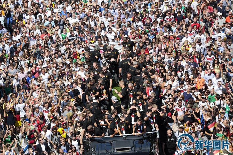 央廣網(wǎng)河南分網(wǎng)消息 據(jù)新華網(wǎng)報(bào)道:當(dāng)?shù)貢r(shí)間2014年7月15日,德國(guó)柏林,德國(guó)隊(duì)歸國(guó)舉行奪冠巡游。在當(dāng)天的奪冠慶;顒(dòng)中,德國(guó)隊(duì)將士的敞篷大巴車(chē)將經(jīng)由柏林的鹿拉教堂街、河畔、萊因哈特街道、luisenstrasse街區(qū)、馬歇爾橋,最終抵達(dá)巴黎廣場(chǎng)。