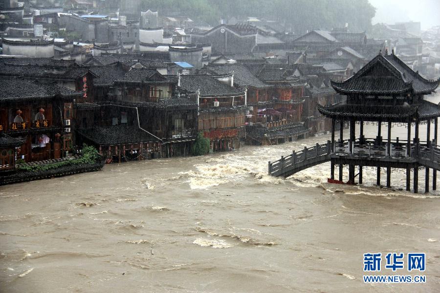 央廣網(wǎng)河南分網(wǎng)消息 據(jù)新華網(wǎng)報(bào)道:7月15日,經(jīng)過一夜暴雨后,鳳凰古城沱江水位上漲,部分商鋪被淹。據(jù)湖南省氣象水文部門監(jiān)測(cè),14日8時(shí)至15日8時(shí),湖南全省大部普降小到中雨,部分大到暴雨,局地大暴雨。15日8時(shí),沅水二級(jí)支流沱江鳳凰站發(fā)生超警洪水,8時(shí)水位304.31米,超警0.81米。新華社發(fā)(章斌 攝)