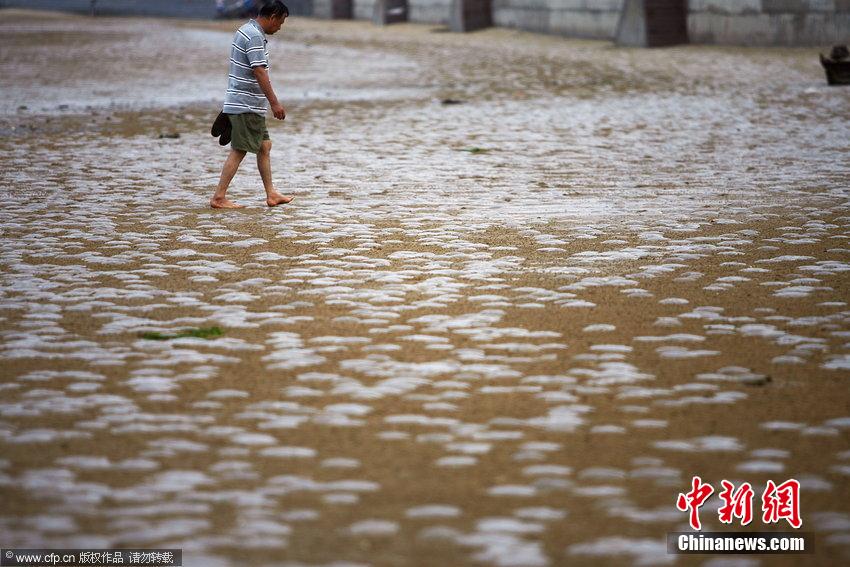 2014年8月30日傍晚,在山東省煙臺市黃海明珠附近海灘,大量水母在退潮后擱淺在沙灘上,密密麻麻,幾乎令人無處下腳。據(jù)了解,每年八月是黃海海域水母繁殖高峰期,由于水母自主游泳能力較差,很容易隨著海流漂移并大量擱淺在沙灘上。圖片來源:CFP視覺中國