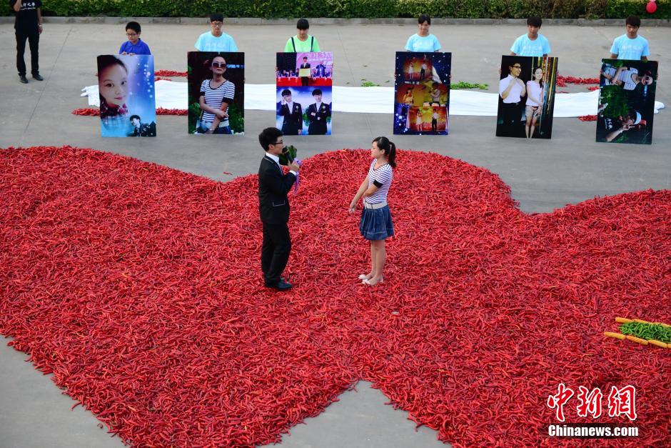 8月29日,河北省邯鄲市雞澤縣小伙兒豆子旺在一辣椒加工企業(yè)上演浪漫一幕,他用九萬九千九百九十九只紅辣椒擺成巨大“心”形,向心儀已久的女友表白求婚,讓在場(chǎng)的人們見證這一浪漫溫馨時(shí)刻。 中新社發(fā) 胡曉華 攝 圖片來源:CNSPHOTO
