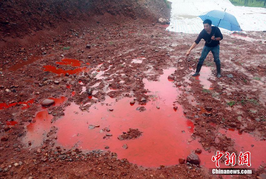 發(fā)現(xiàn)了一座廠房,從山腰看廠里冷冷清清,院內(nèi)有幾個(gè)較大的罐體。“‘紅水’就是從這個(gè)廠排出來的。”李先生說,這是家染料廠,他們將山頂削平,在山頂上建了一個(gè)處理池,將生產(chǎn)殘留用管道抽到池子里處理!斑@次出現(xiàn)‘紅水’的原因,可能是由于連日下雨,導(dǎo)致處理池溢出所致!